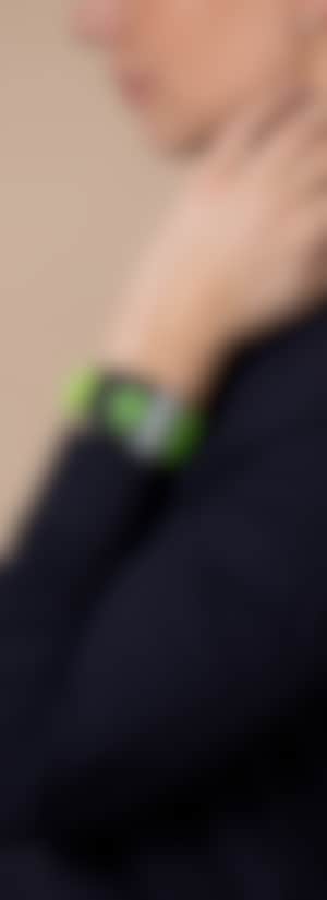 自1983年首次亮相以來,Rado瑞士雷達表Anatom拱形系列一直是突破性設計與卓越舒適的代名詞。其標誌性特徵在於圓柱形金屬鍍層藍寶石水晶錶鏡——兩側對稱斜面切割,倒角線條無縫流瀉至拋光高科技陶瓷錶殼,繼而延伸至拋光精鋼錶耳,最終與萊姆綠錐形橡膠錶帶渾然交融。此整體式設計由拉絲精鋼三折式錶扣穩固銜接,搭配拋光高科技陶瓷扣面。 在這塊獨特的水晶之下,是黑色至萊姆綠漸變錶盤。覆有白色Super-LumiNova®夜光塗層的銠色指針和時標,與錶盤的深邃色彩形成精緻的對比。錶盤12點鐘位置上飾有經典的可擺動錨型標誌,與6點鐘位置低調的日期窗口相得益彰。 透過藍寶石水晶底蓋,可盡情欣賞鑲有21顆寶石的R766型自動機械機芯在錶殼內律動的美感。機芯經五個方位精密調節,搭載Nivachron™游絲,提供高精準度和強勁的72小時動力儲存,彰顯Rado瑞士雷達錶對完美的承諾。