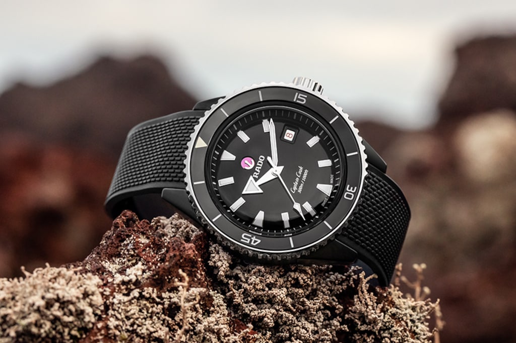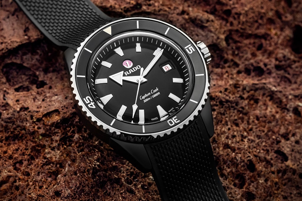 Captain Cook庫克船長高科技陶瓷潛水腕錶的防水性能經ISO 6425認證,深達300米。指針與刻度覆有Super-LumiNova®夜光塗層,與黑色漆面拋光錶盤形成鮮明對比,確保佩戴者能夠輕鬆讀取時間。整體式構造錶殼直徑43毫米,由啞光黑色高科技陶瓷製成,旋轉錶圈則採用拋光硬化精鋼材質。腕錶搭載Rado R763自動機芯,較標準精準度測試要求超出整整五分,動力儲存長達80小時。這一款式搭配啞光黑色橡膠錶帶。無論您的探索領域為何,您的Captain Cook庫克船長高科技陶瓷潛水腕錶都將證明它是個可靠而堅韌,值得長年同行的夥伴。