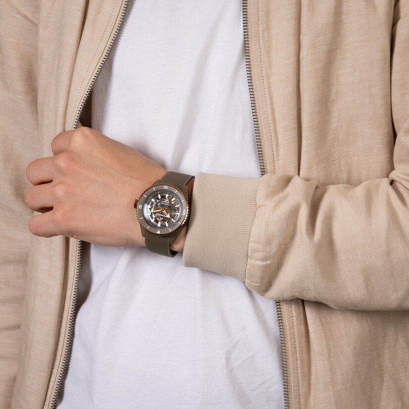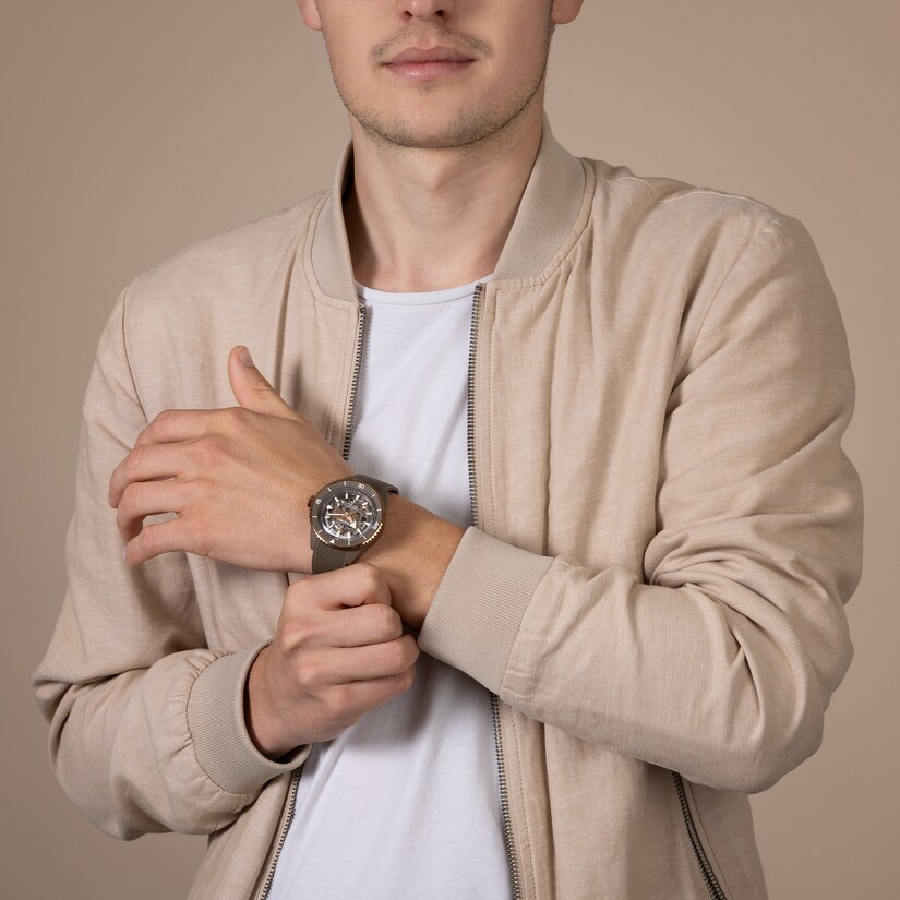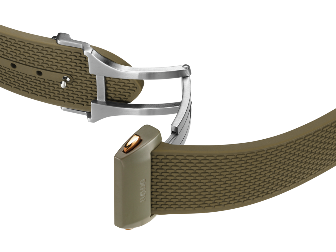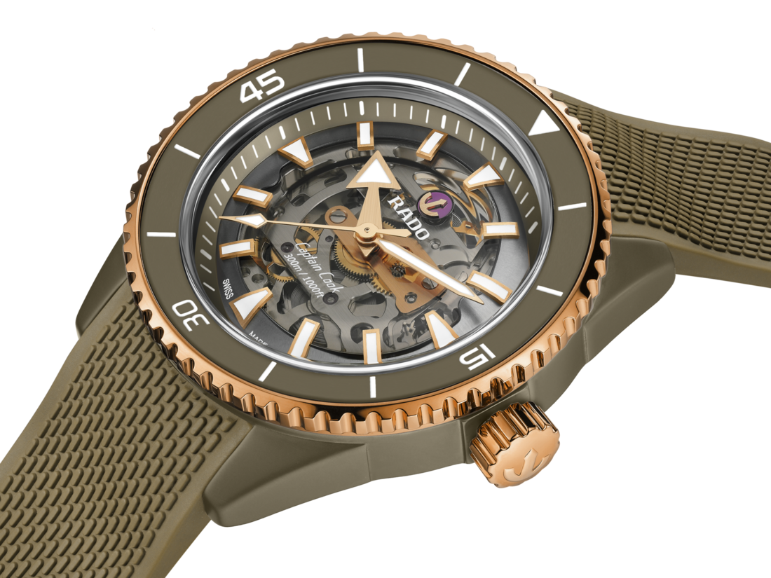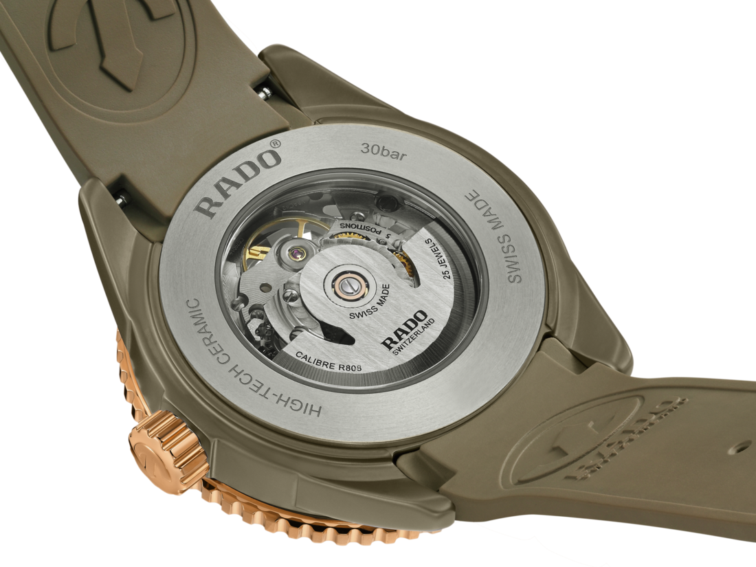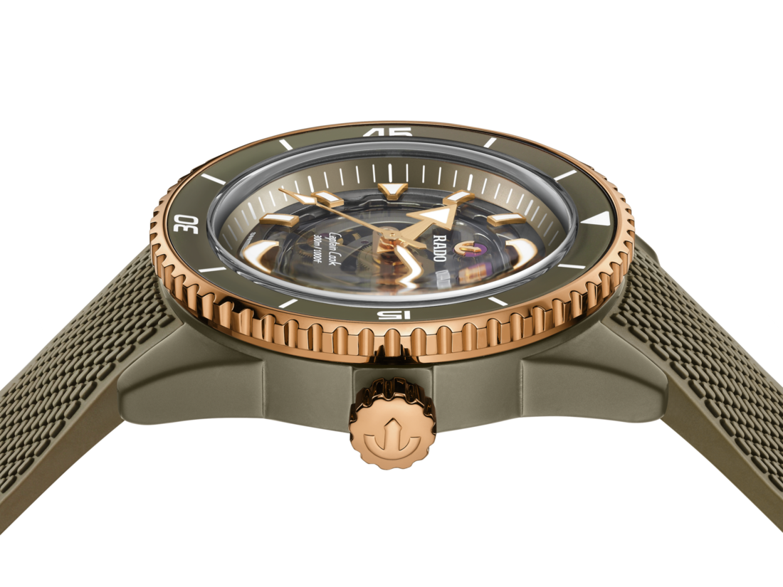 Captain Cook庫克船長高科技陶瓷鏤空腕錶搭載創新型R808機芯,對比鮮明的設計、頂尖製錶技藝,以及巧妙的幾何形狀令人嘆為觀止。愛錶人士可以清楚鑑賞各個零件的運轉。腕錶搭載高度可靠的防磁NivachronTM游絲,且在五個方位進行了全面測試,並提供長達80小時的動力儲存。精美的霧面橄欖綠高科技陶瓷整體式構造錶殼,搭配玫瑰金色可旋轉錶圈,內嵌霧面橄欖綠陶瓷襯片,與錶殼和錶耳和諧互搭,相得益彰。錶盤清晰簡潔,配有寬大的幾何設計時標和玫瑰金色調的時/分/秒針,並覆有白色Super-LumiNova®夜光塗層,確保在低光源條件下依然能夠清晰讀時。新款Captain Cook庫克船長腕錶搭配橄欖色橡膠錶帶和高科技陶瓷錶扣蓋,展現出活力動感的一面。