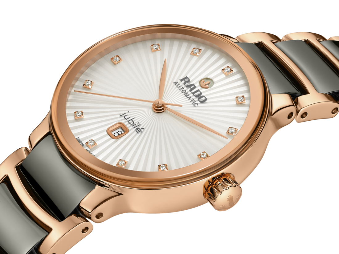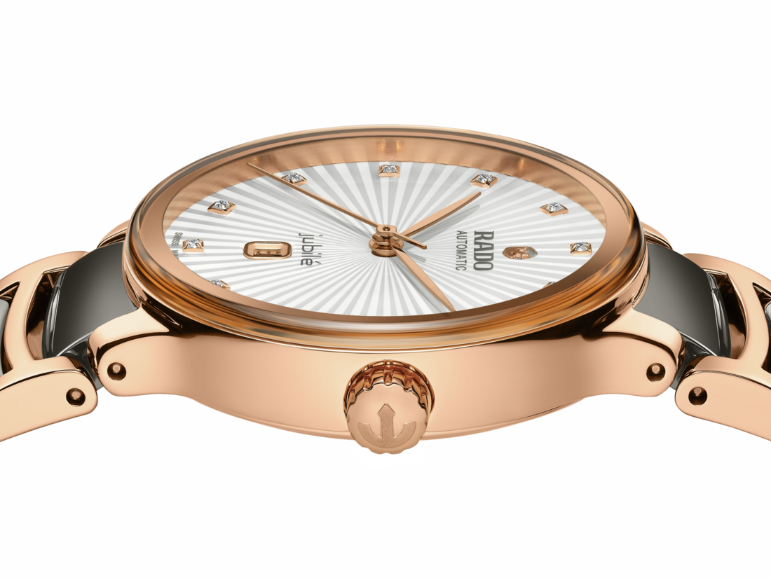 經典Centrix晶萃系列鑲鑽自動機械腕錶不僅在技術上進行調整,亦在美學上予以重新設計。修改後的錶款,擁有一個圓形的無邊框藍寶石水晶玻璃錶鏡,以及一個與弧形水晶邊緣渾然天成的弧形錶殼。調整後的錶耳和搭配等離子高科技陶瓷中央鏈節的拋光玫瑰金PVD塗層精鋼錶鏈,令這款經典時計的整體外觀更臻完美。錶盤透過壓印成型並以漆面填充,為棕色刻面錶盤創造出華麗的 3D 效果。由於搭載Nivachron™防磁游絲,使這款R582型三針機芯在3至5個位置上遠超標準測試要求,實現更高的可靠性和精確度。這款腕錶防水深度可達50公尺,並提供48小時的動力儲存。