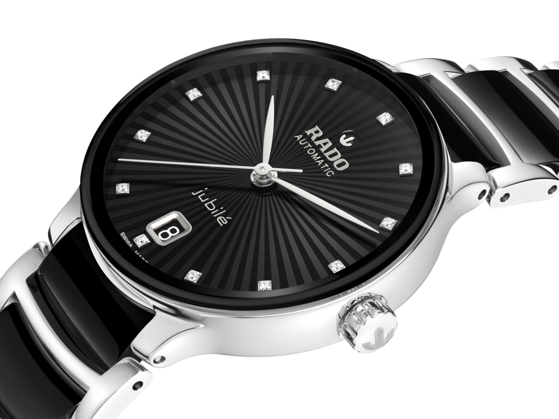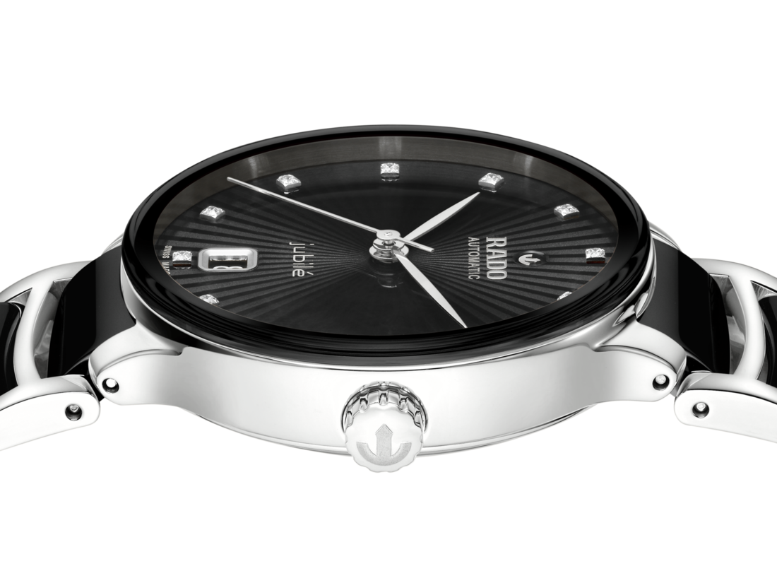Experience the harmonious blend of visual harmony and artistic expression with the Rado Centrix Automatic Diamonds watch. A gently curved sapphire crystal with a rounded edge, bonded to the case, completes the design and gives perfect readability, thanks to anti-reflective coating on both faces. Inside, the three-hand calibre R763 movement exceeds standard accuracy test requirements from 3 to 5 positions, thanks to its antimagnetic Nivachron™ hairspring for increased reliability and accuracy. The overall appearance of this iconic timepiece is completed with adjusted case lugs and a bracelet made of polished stainless steel with black high-tech ceramic middle links. The black facetted dial with 12 diamonds has an opulent 3D effect created by stamping a shaped dial and then filling it with lacquer. The watch is water resistant down to 50 m and offers 80 hours of power reserve.