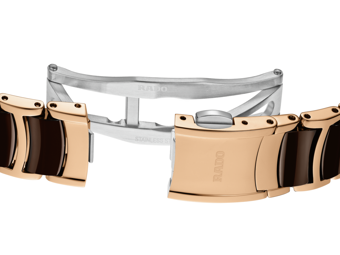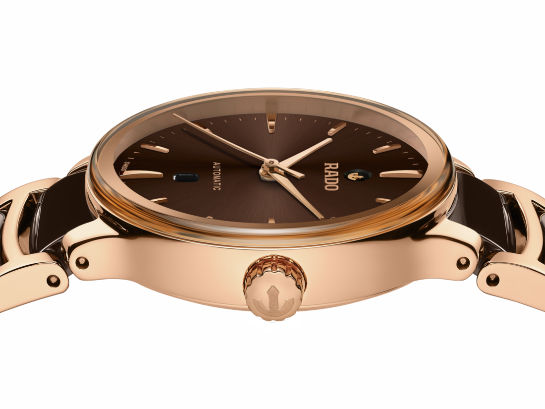 經典Centrix晶萃系列自動機械腕錶不僅在技術上進行調整,亦在美學上予以重新設計。修改後的錶款,擁有一個圓形的無邊框藍寶石水晶玻璃錶鏡,以及一個與弧形水晶邊緣渾然天成的弧形錶殼。調整後的錶耳和搭配棕色高科技陶瓷中央鏈節的拋光玫瑰金PVD塗層精鋼錶鏈,令這款經典時計的整體外觀更臻完美。棕色的太陽紋錶盤搭配玫瑰金時標,與玫瑰金色指針相得益彰。由於搭載Nivachron™防磁游絲,使這款R582型三針機芯在3至5個位置上遠超標準測試要求,實現更高的可靠性和精確度。這款腕錶防水深度可達50公尺,並提供48小時的動力儲存。