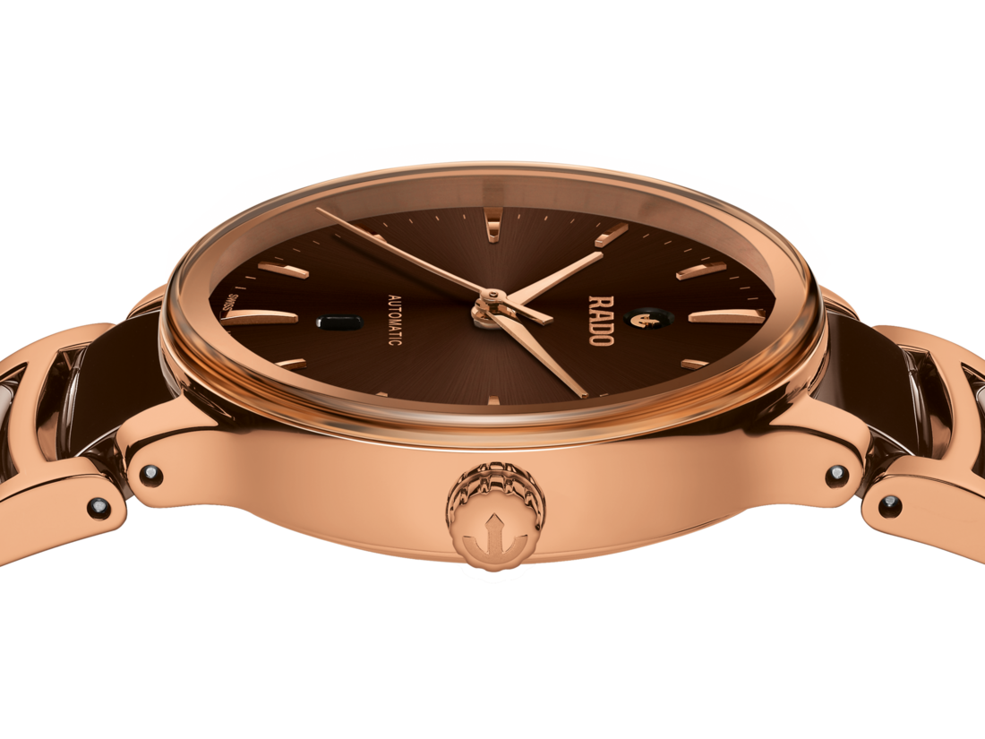 經典Centrix晶萃系列石英腕錶不僅在技術上進行調整,亦在美學上予以重新設計。改款後的錶款,擁有一個圓形的無邊框藍寶石水晶玻璃錶鏡,以及一個與弧形水晶邊緣渾然天成的弧形錶殼。全新改款的錶耳和搭配棕色高科技陶瓷中央鏈節的拋光玫瑰金色PVD塗層精鋼錶鏈,令這款經典時計的整體外觀更臻完美。棕色太陽紋錶盤搭配玫瑰金色時標,與玫瑰金色指針相得益彰。搭載PreciDrive和HeavyDrive技術的R079型石英機芯,讓腕錶具有更加優異的精準度和抗震性。腕錶防水深度達50公尺。