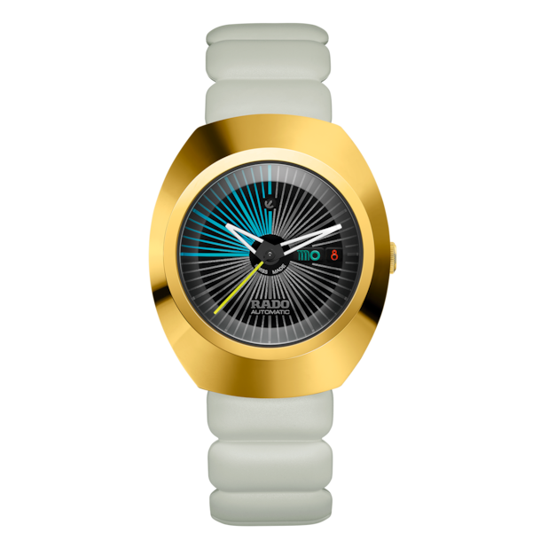 Rado瑞士雷達表DiaStar鑽星系列創始型腕錶以其瑞士製錶工藝與前瞻設計理念而聞名,並在全球知名工業設計師Tej Chauhan的巧思重塑下,展現大膽新貌。 38毫米錶殼,鑲嵌拋光黃金色PVD塗層Ceramos™金屬陶瓷錶圈,與拋光黃金色PVD塗層精鋼中層錶殼和諧相融,防水性能高達10巴(100米)。 啞光黑色內凹錶盤充分體現Rado瑞士雷達表對技術細節的精湛掌控,搭配銀藍相間的分鐘刻度,並輔以每五分鐘一枚的浮雕立體時標。在12點與6點鐘位置,經噴砂處理的黑金色Rado瑞士雷達表經典可擺動錨型標誌與品牌Logo驕傲地矗立其間。3點鐘位置設有日期與星期顯示窗,採用Tej Chauhan專屬字體,並運用包括霓虹塗料在內的鮮豔色彩搭配。 拋光黑金色時、分針覆有白色Super-LumiNova®夜光塗層,搭配一抹霓黃色點綴的秒針,無論白晝或黑夜皆能保證絕佳辨識度。此腕錶配備放射形切割藍寶石水晶鏡面,內層加強抗反光塗層,確保呈現無瑕透明視野。 R764自動上鏈機芯為腕錶提供強勁動力,機芯經五個方位精密調節,搭載Nivachron™抗磁游絲,提供高精準度和80小時動力儲存。錶款整體搭配極具突破性的灰色枕形橡膠錶帶,由深灰色PVD鍍層精鋼可調折疊式錶扣固定,錶扣上覆有黃金色蓋板,按鈕上雕刻Rado x TC字樣,盡顯奢華與細節之美。