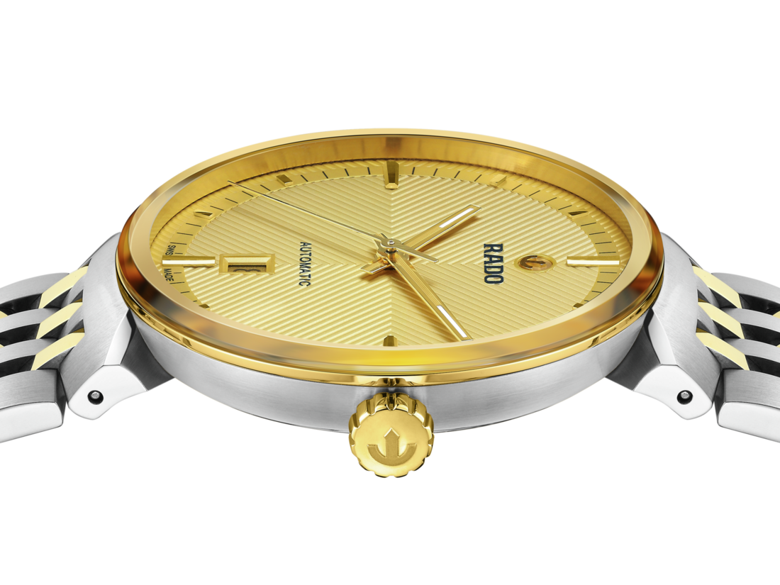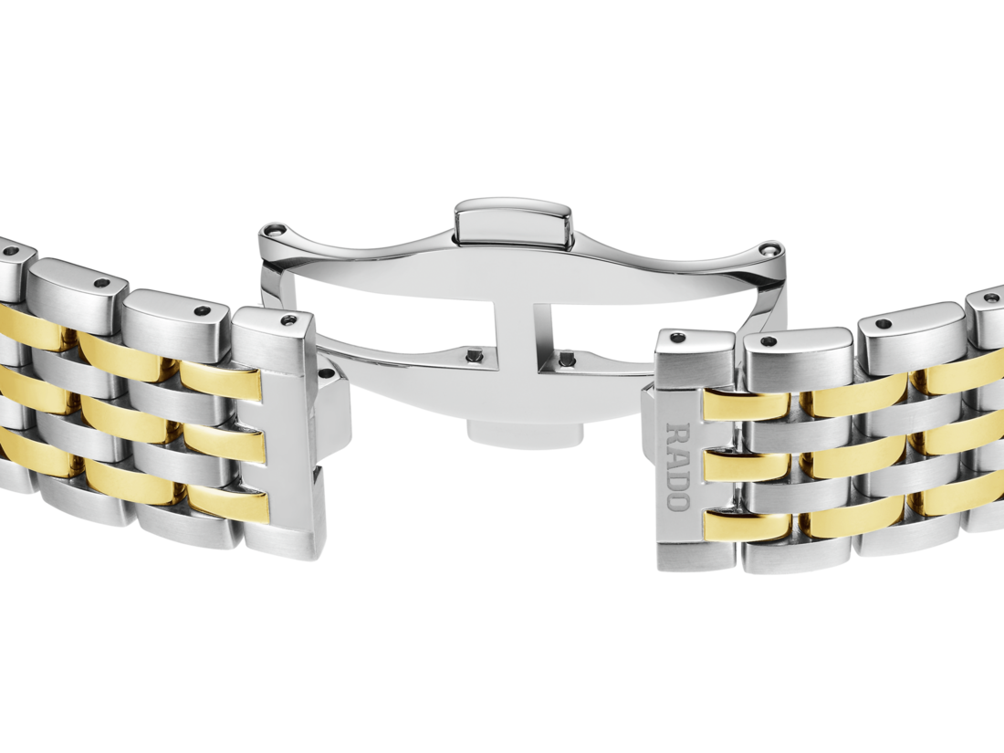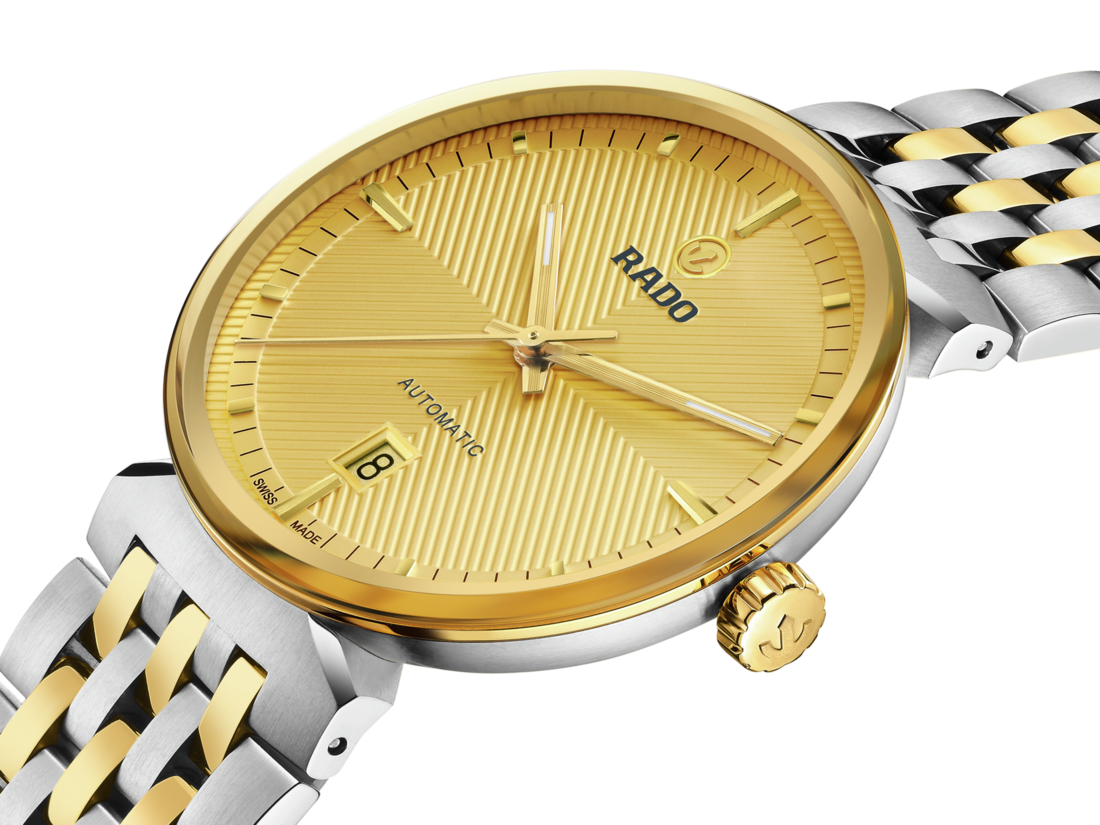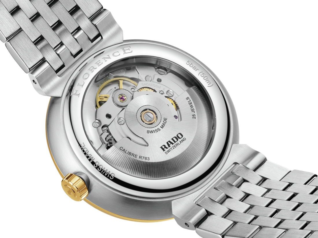 隨經典Rado瑞士雷達表Florence佛羅倫斯系列腕錶一起探索瑞士精準與優雅的永恆融合。 39毫米錶殼覆以無邊框藍寶石水晶錶鏡,金屬鍍層邊緣與黃金色錶盤彼此呼應。藍寶石水晶既可保護錶盤,又能作為黃金色PVD塗層錶圈,無縫融入錶殼之中,凸顯Florence佛羅倫斯系列極具代表性的精緻輪廓。 黃金色錶盤猶如戲劇舞台,精緻的壓印圖案盡顯對細節的講究。黃金色時標與其上方的可擺動錨型標誌經過拉絲和拋光處理,與黃金色背景和諧相融。 錶殼搭配雙色錶鏈,拋光黃金色PVD塗層精鋼鏈節與拉絲精鋼鏈節交相呼應,以精鋼三折式錶扣固定。盒形藍寶石水晶底蓋下方隱藏著Florence佛羅倫斯腕錶的靈魂:R763型自動機芯。機芯經五個方位精密調節,搭載Nivachron™防磁游絲,提供高精準度和強勁的80小時動力儲存,彰顯Rado瑞士雷達錶對完美的承諾。