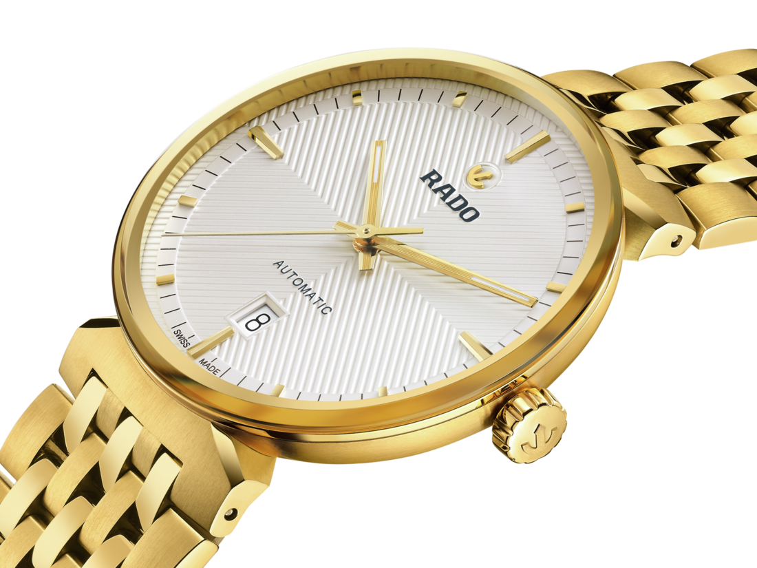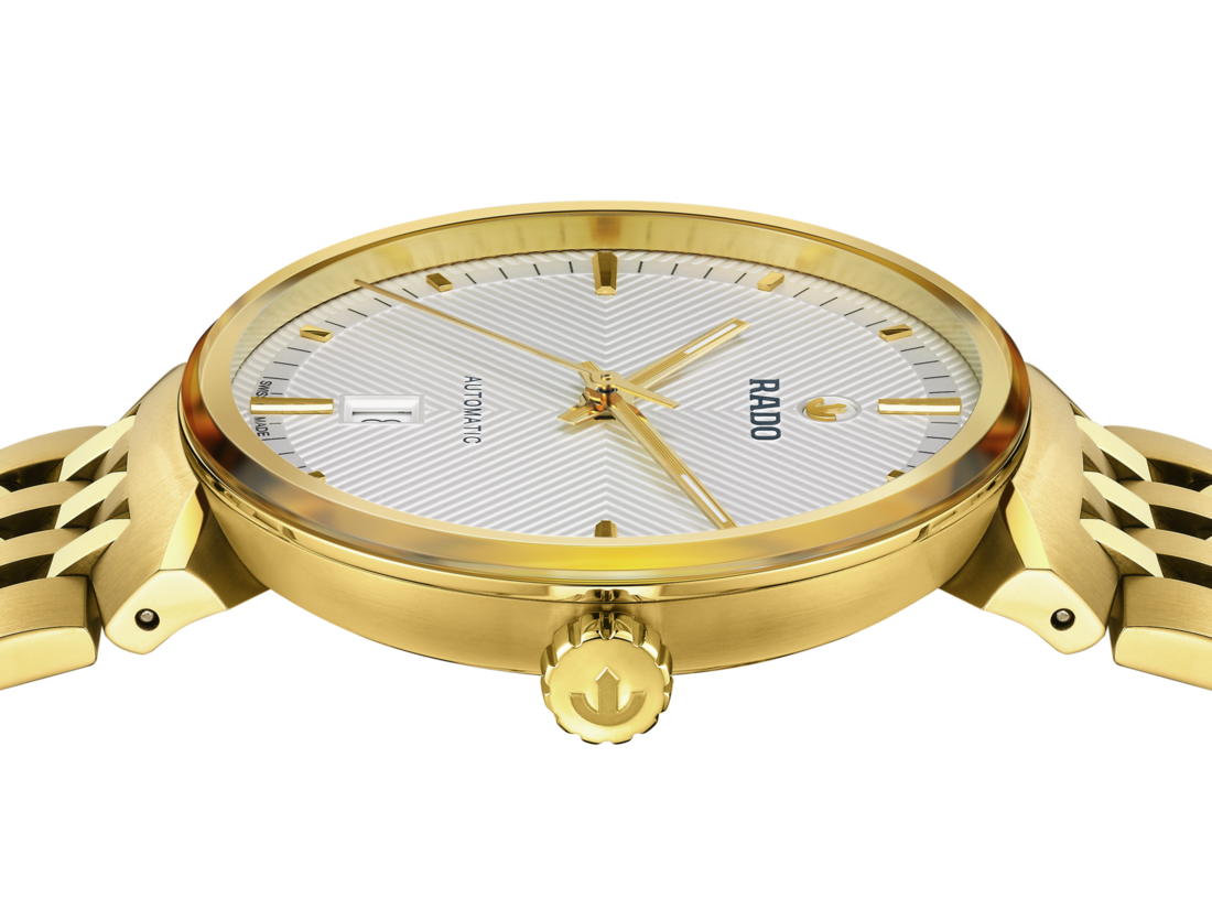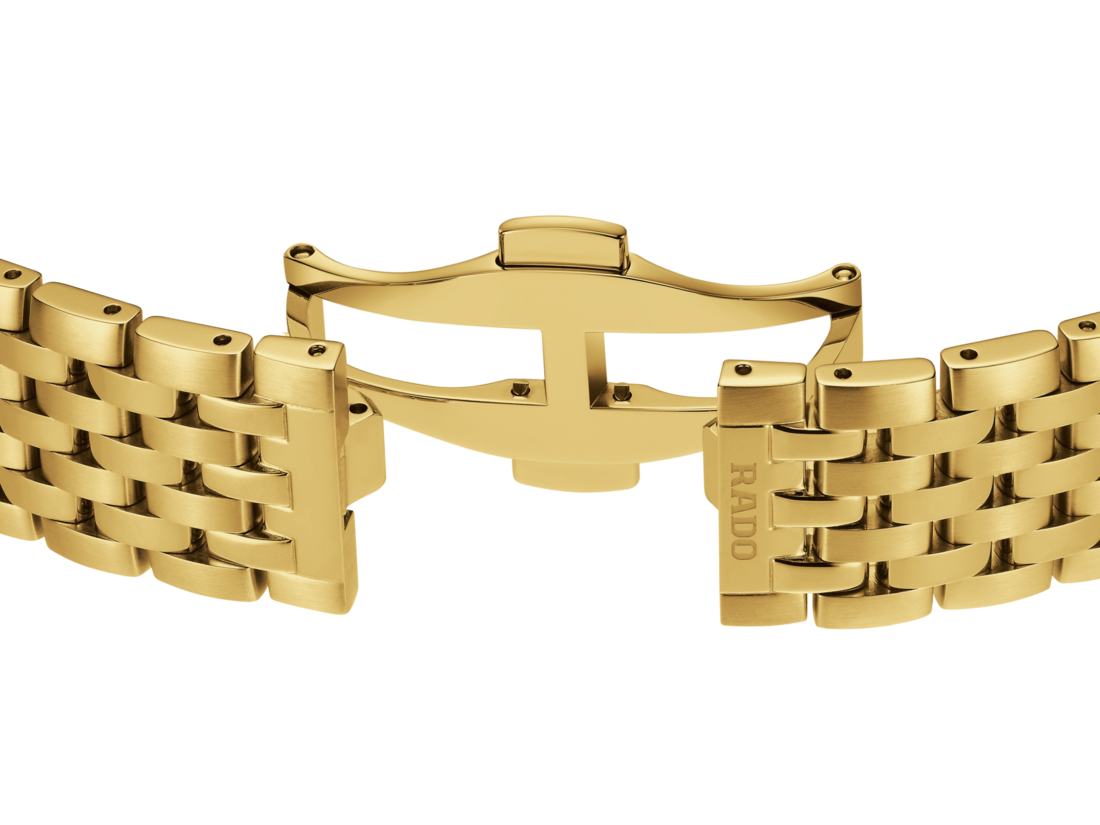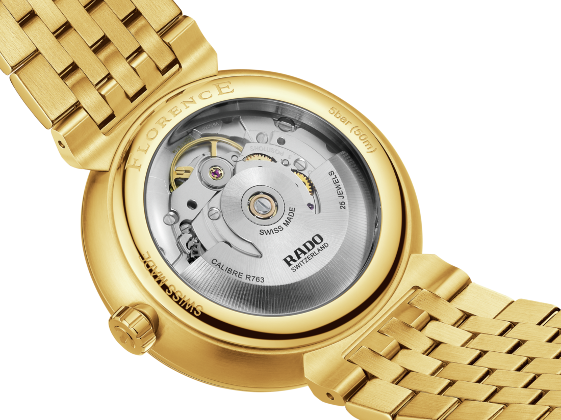 隨經典Rado瑞士雷達表Florence佛羅倫斯系列腕錶一起探索瑞士精準與優雅的永恆融合。 39毫米錶殼覆以無邊框藍寶石水晶錶鏡,金屬鍍層邊緣與黃金色錶殼彼此呼應。藍寶石水晶既可保護錶盤,又能作為錶圈,無縫融入錶殼之中,凸顯Florence佛羅倫斯系列極具代表性的精緻輪廓。 銀白色錶盤猶如戲劇舞台,精緻的壓印圖案盡顯對細節的講究。對比鮮明的黃金色時標與其上方的可擺動錨型標誌經過拉絲和拋光處理,與銀白色背景形成迷人對比。 錶殼搭配黃金色PVD塗層精鋼錶鏈,鏈節經拉絲和拋光處理,以精鋼三折式錶扣固定。盒形藍寶石水晶底蓋下方隱藏著Florence佛羅倫斯腕錶的靈魂:R763型自動機芯。機芯經五個方位精密調節,搭載Nivachron™防磁游絲,提供高精準度和強勁的80小時動力儲存,彰顯Rado瑞士雷達錶對完美的承諾。