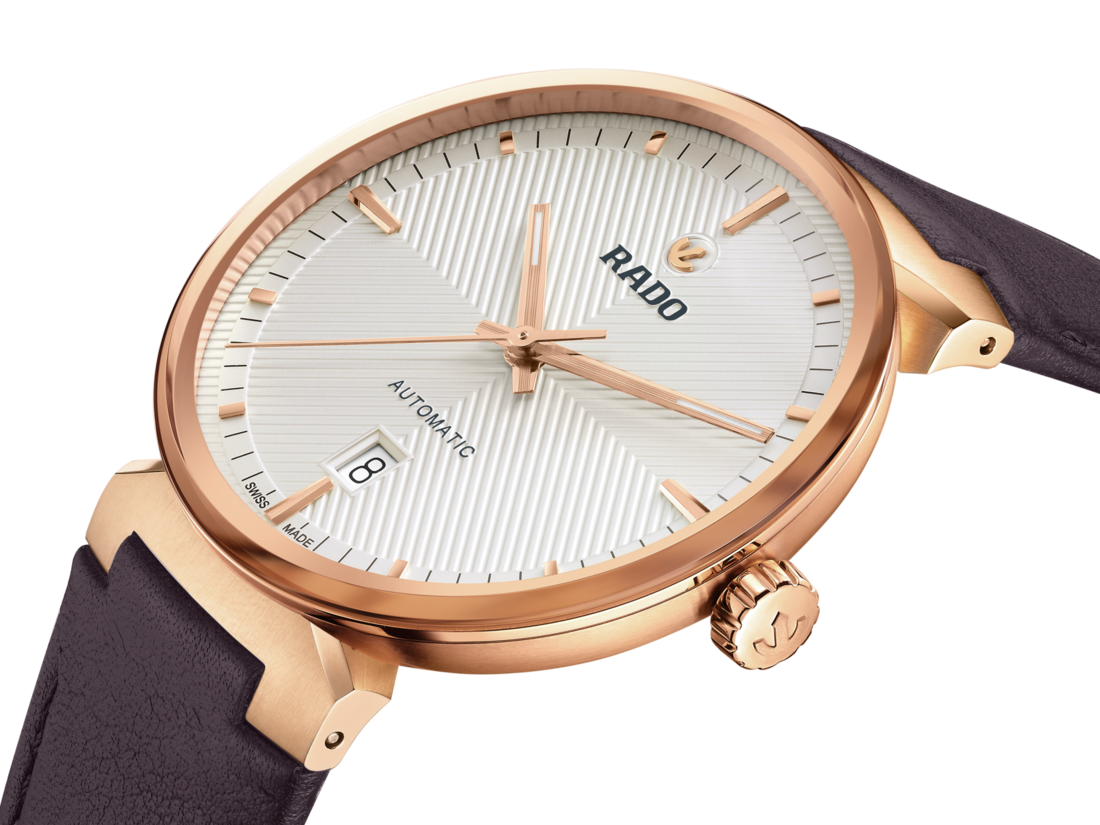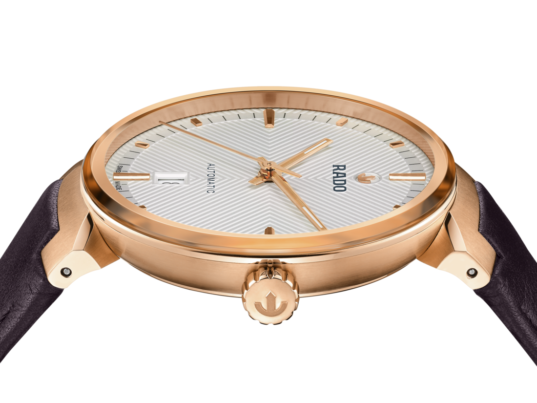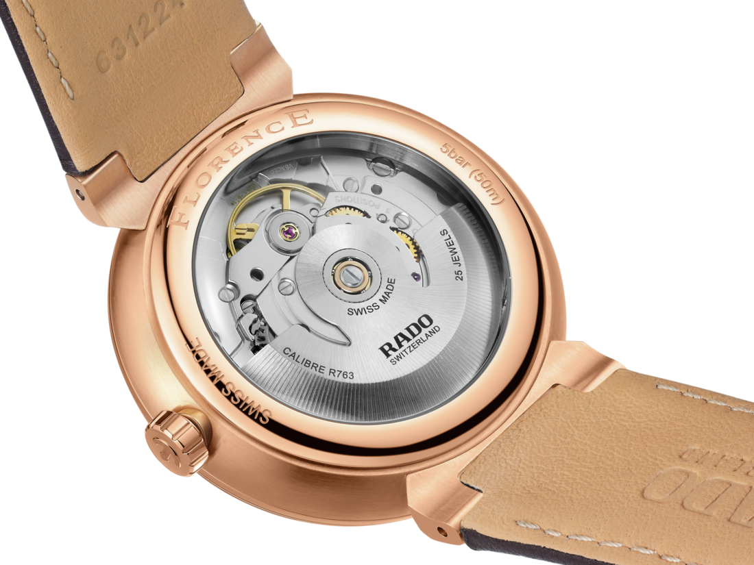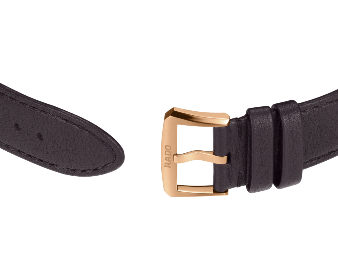 隨經典Rado瑞士雷達表Florence佛羅倫斯系列腕錶一起探索瑞士精準與優雅的永恆融合。 39毫米錶殼覆以無邊框藍寶石水晶錶鏡,金屬鍍層邊緣與玫瑰金色錶殼彼此呼應。藍寶石水晶既可保護錶盤,又能作為錶圈,無縫融入錶殼之中,凸顯Florence佛羅倫斯系列極具代表性的精緻輪廓。 銀白色錶盤猶如戲劇舞台,精緻的壓印圖案盡顯對細節的講究。對比鮮明的玫瑰金色時標與其上方的可擺動錨型標誌經過拉絲和拋光處理,與銀白色背景形成迷人對比。 錶殼搭配棕色皮革錶帶,末端鏈節比例和諧,以玫瑰金PVD塗層精鋼針扣固定。盒形藍寶石水晶底蓋下方隱藏著Florence佛羅倫斯腕錶的靈魂:R763型自動機芯。機芯經五個方位精密調節,搭載Nivachron™防磁游絲,提供高精準度和強勁的80小時動力儲存,彰顯Rado瑞士雷達錶對完美的承諾。