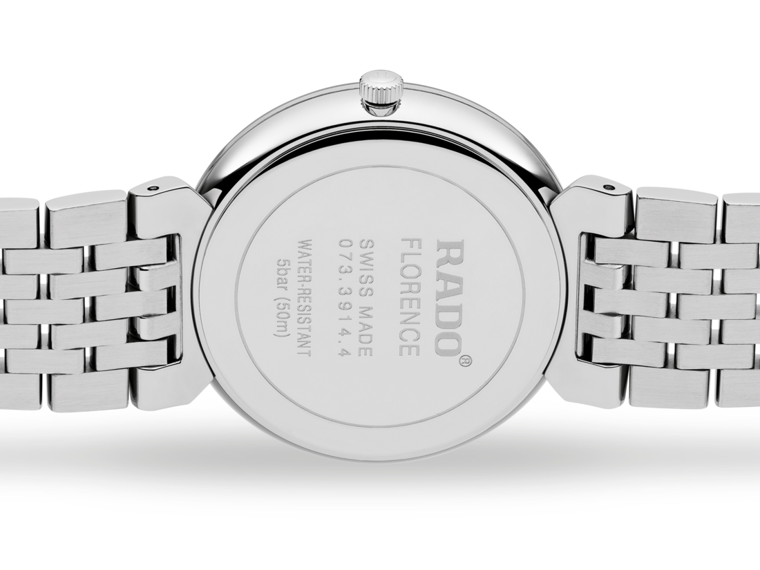 Rado瑞士雷達表Florence佛羅倫薩系列的和諧設計,令人想起腕錶命名城市的典雅圓頂和鐘塔。憑藉優質的石英機芯、創新的Rado瑞士雷達表無框金屬化藍寶石水晶玻璃錶鏡和鑽石的永恆魅力,這是一款經得起時間考驗的瑞士製造腕錶。鍍銠指針優雅滑行於4顆足瓣切割鑽石之上,這四顆鑽石分別位於3點、6點、9點和12點鐘的位置。同時,在這款全新Rado瑞士雷達表Florence Classic佛羅倫斯經典系列中,著名的鑲鑽標誌強勢回歸,向世人展示著其閃亮存在。