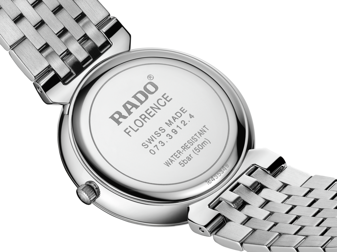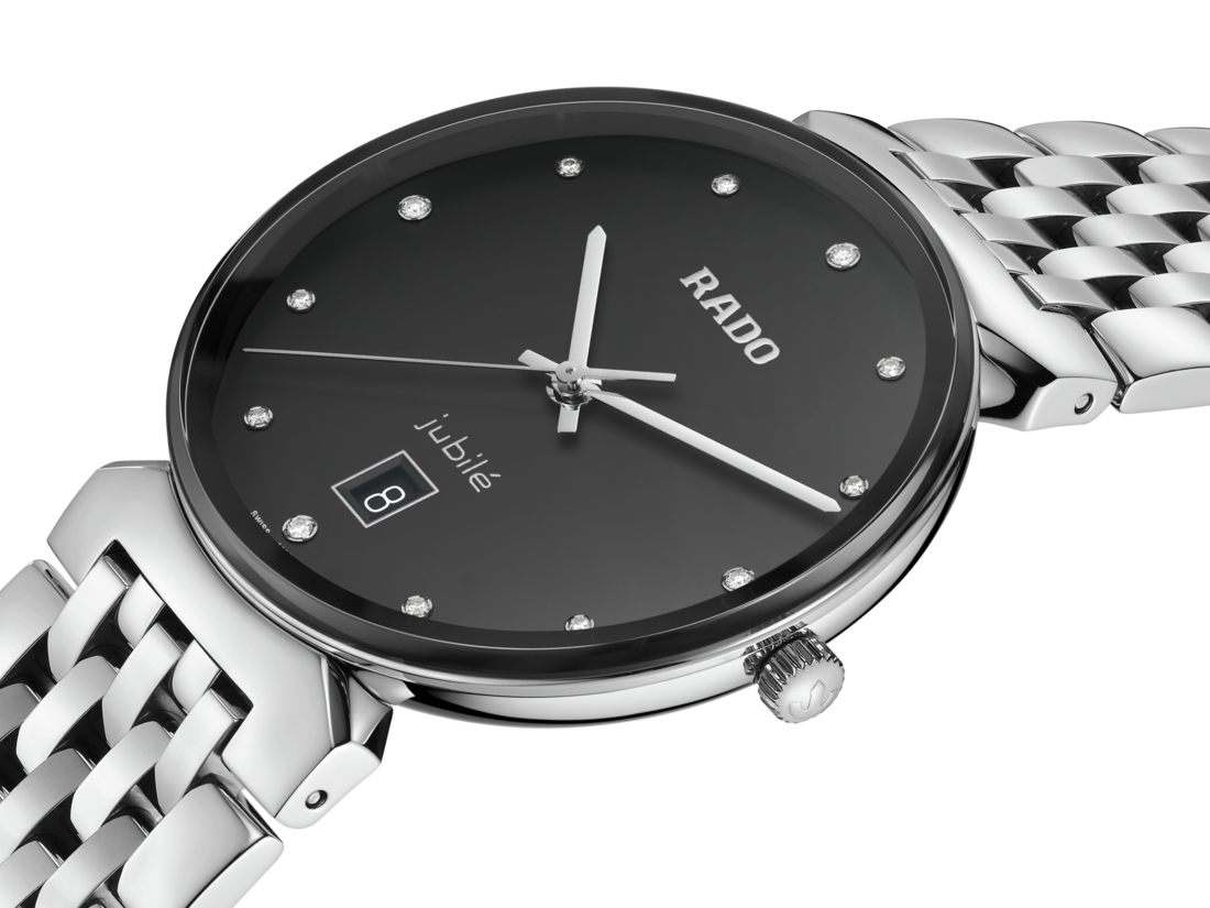 Rado瑞士雷達表Florence佛羅倫斯經典系列的和諧設計,令人想起腕錶命名城市的典雅圓頂和鐘塔。這款38毫米腕錶擁有無邊框弧形斜面藍寶石水晶玻璃錶鏡。錶殼、錶圈、錶冠和錶鏈均採用拋光精鋼製成。黑色太陽紋錶盤鑲嵌著12顆鑽石,印有「jubilé」標誌,與銠色指針完美搭配。搭載三針R073型石英機芯,讓腕錶具有更加優異的精度和抗震性。腕錶防水性能達50公尺。此外,另有小尺寸可供挑選,是理想的情侶款腕錶。