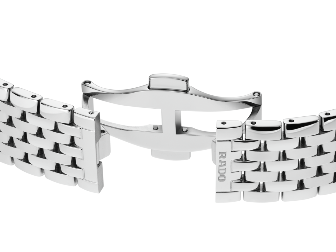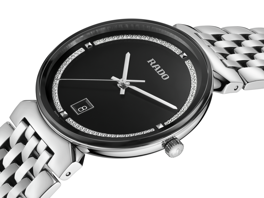 The harmonious design of the Rado Florence calls to mind the elegant domes and towers of the city from which the collection takes its name. Powered by a reliable three-hand Quartz Rado calibre R073 movement, this watch ensures greater accuracy and resistance to shocks. The 38 mm watch has an edge-to-edge-bevelled, curved sapphire crystal. The watch boasts a polished stainless steel case, crown, bezel and case back. The bracelet made of polished stainless steel completes the overall appearance of this classic timepiece. The black dial with rhodium glitter decoration, emphasised with the silver coloured printed “Rado” logo, matches perfectly with the rhodium coloured hands. The watch is water resistant down to 50 m and is also available in S size, which makes it an ideal couples’ watch.