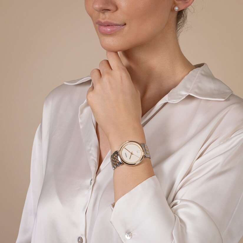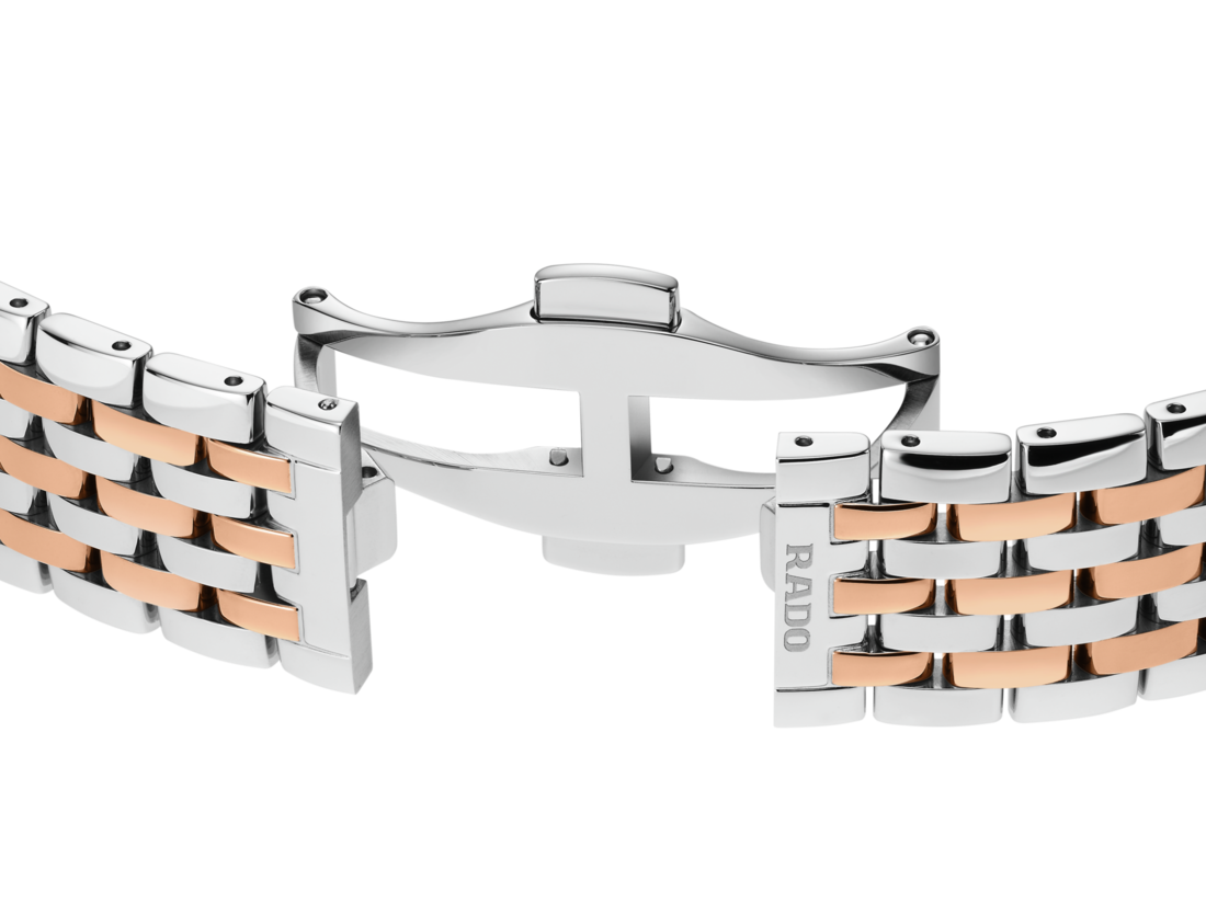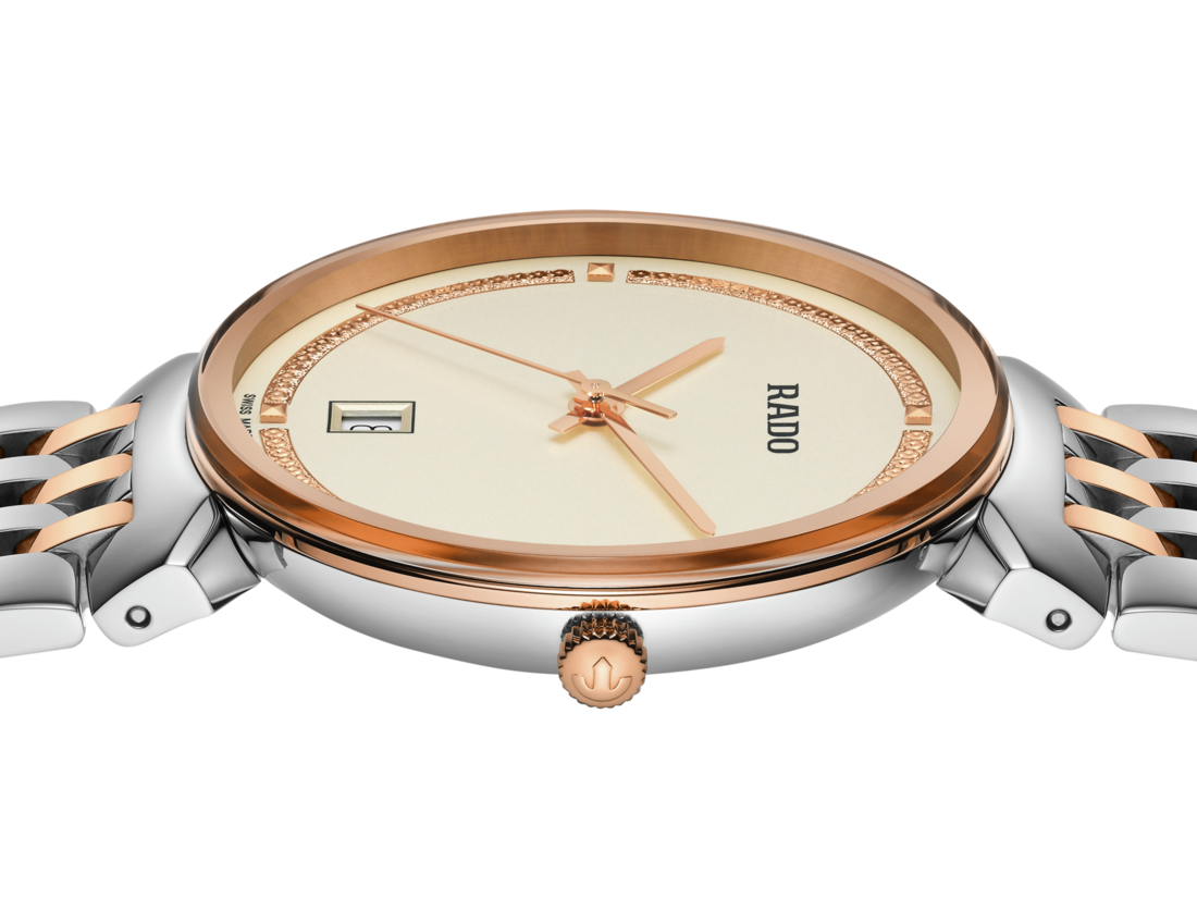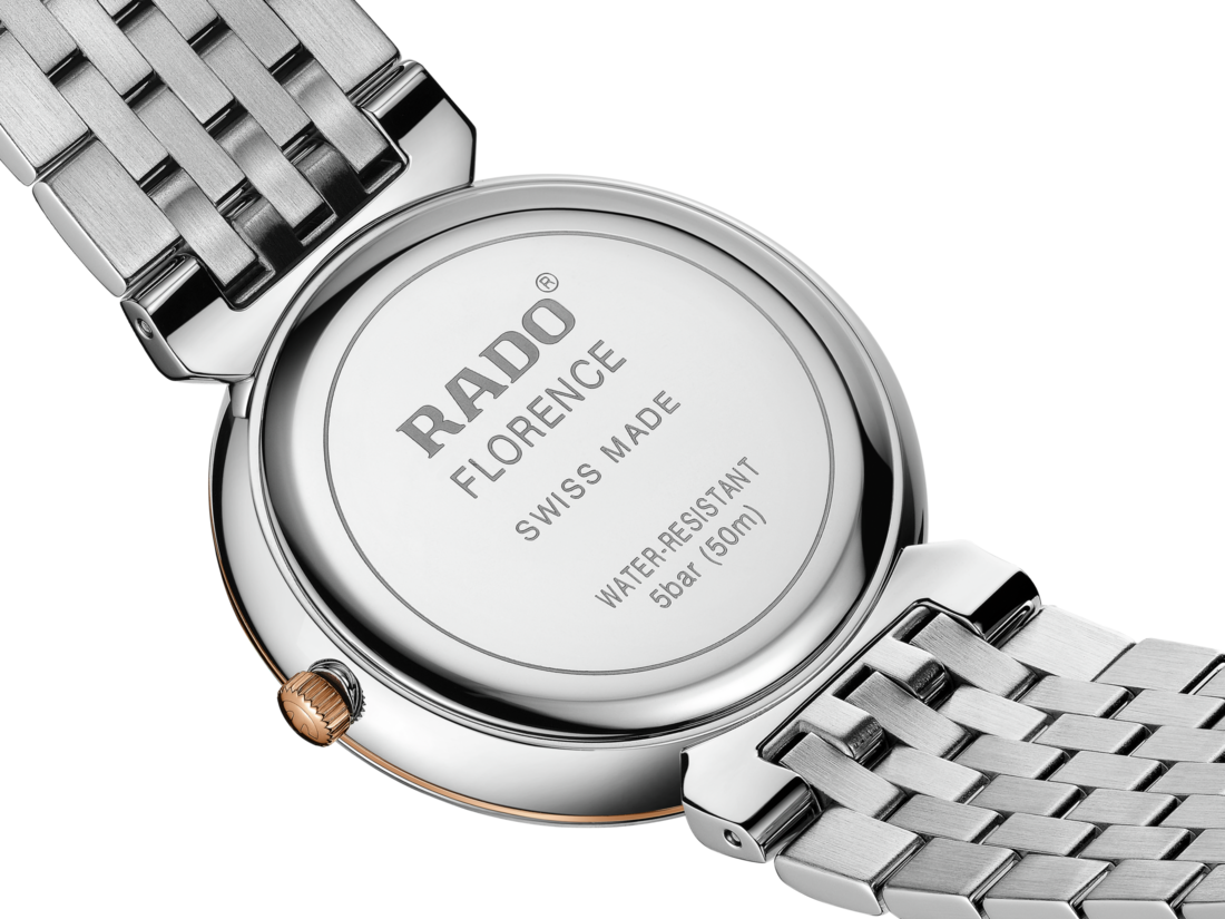 Rado瑞士雷達表Florence佛羅倫斯經典系列的和諧設計,令人想起腕錶命名城市的典雅圓頂和鐘塔。搭載性能可靠的三針R073型石英機芯,讓腕錶具有更加優異的精度和抗震性。這款38毫米腕錶擁有無邊框弧形斜面藍寶石水晶玻璃錶鏡。腕錶採用拋光精鋼錶殼、錶冠、錶圈和底蓋。採用拋光精鋼製成的錶鏈,搭配玫瑰間金中央鏈節,令這款經典時計的整體外觀更臻完美。香檳金色錶盤搭配耀眼玫瑰金色裝飾,並飾有灰色「Rado」標誌,與玫瑰金色指針相呼應。腕錶防水性能達50公尺。此外,另有小尺寸可供挑選,是理想的情侶款腕錶。