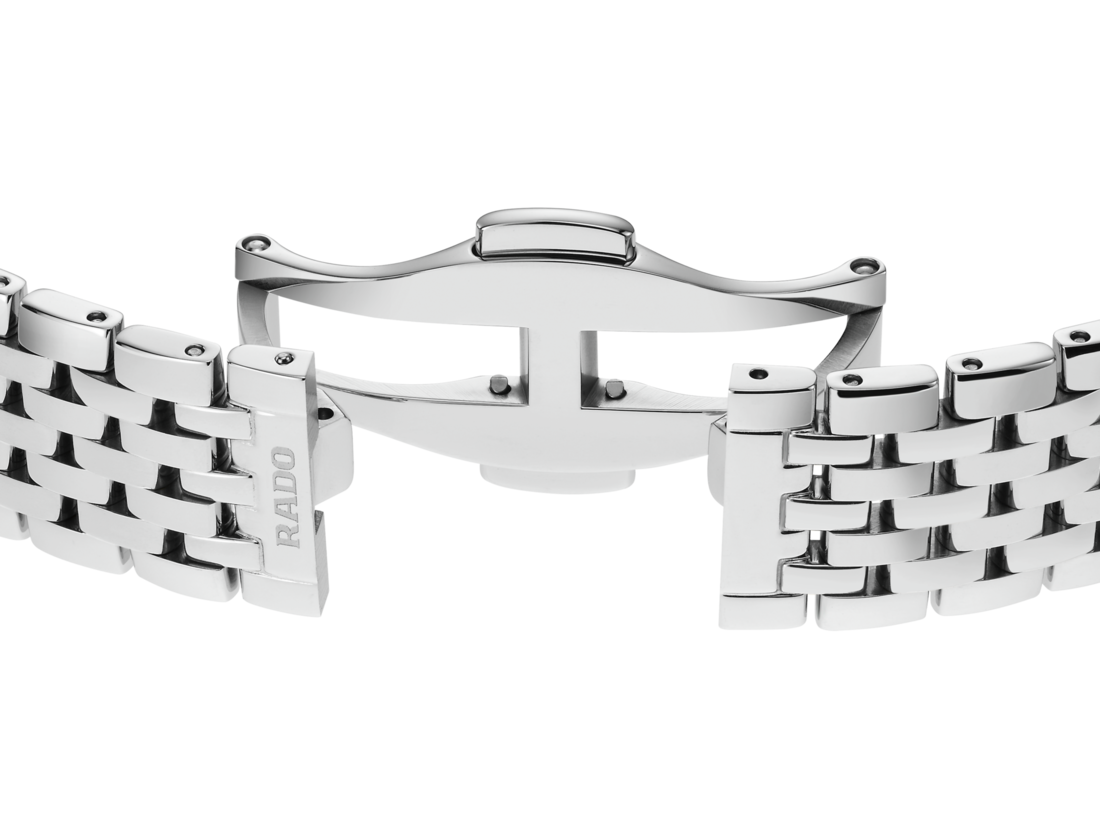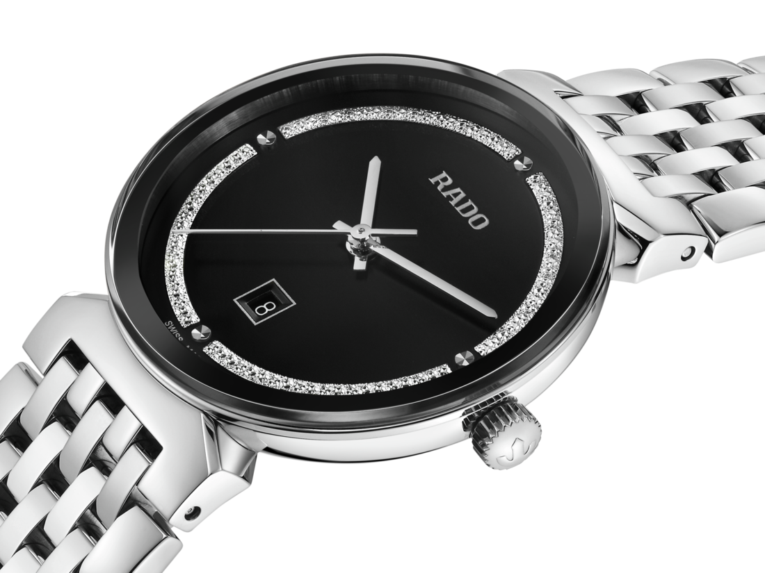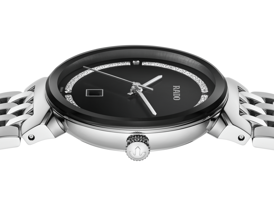 The harmonious design of the Rado Florence calls to mind the elegant domes and towers of the city from which the collection takes its name. Powered by a reliable three-hand Quartz Rado calibre R079 movement, this watch ensures greater accuracy and resistance to shocks. The 30 mm watch has an edge-to-edge-bevelled, curved sapphire crystal. The watch boasts a polished stainless steel case, crown, bezel and case back. The bracelet made of polished stainless steel completes the overall appearance of this classic timepiece. The black dial with rhodium glitter decoration, emphasised with the silver coloured printed “Rado” logo, matches perfectly with the rhodium coloured hands. The watch is water resistant down to 50 m and is also available in L size, which makes it an ideal couples’ watch.